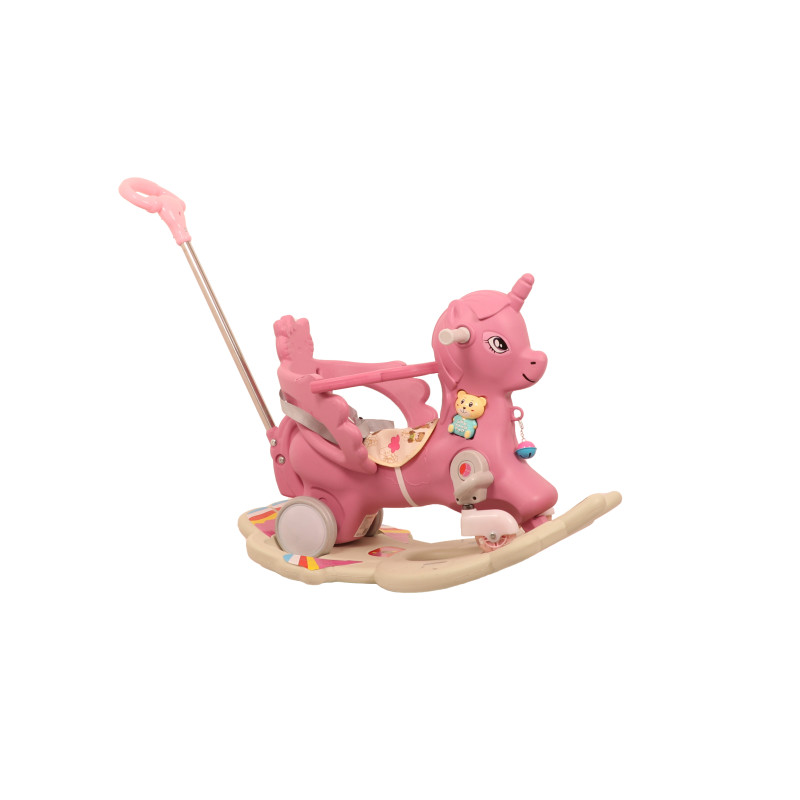 ► На главата на еднорогот има рачки за поголема стабилност на детето при нишањето, а над предните тркала се наоѓа потпирач за нозете